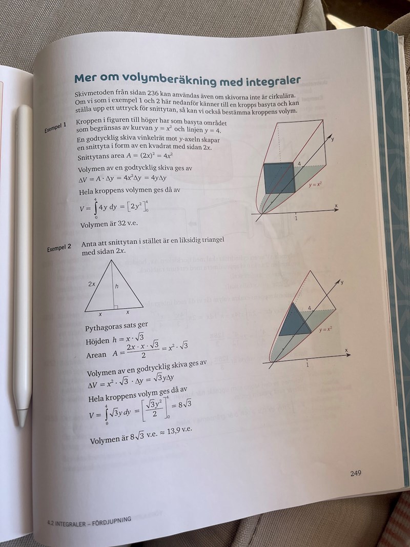 Hej! I uppgiften och i exemplet som är bifogat står det att skivorna är vinkelräta mot y-axeln. Stämmer det verkligen i uppgift 3344, är det inte mot x-axeln? Lade även upp min lösning då jag har en fråga, varför ska man uttrycka arean i y? Förstår inte riktigt vad man ska uttrycka arean i (y resp x)
