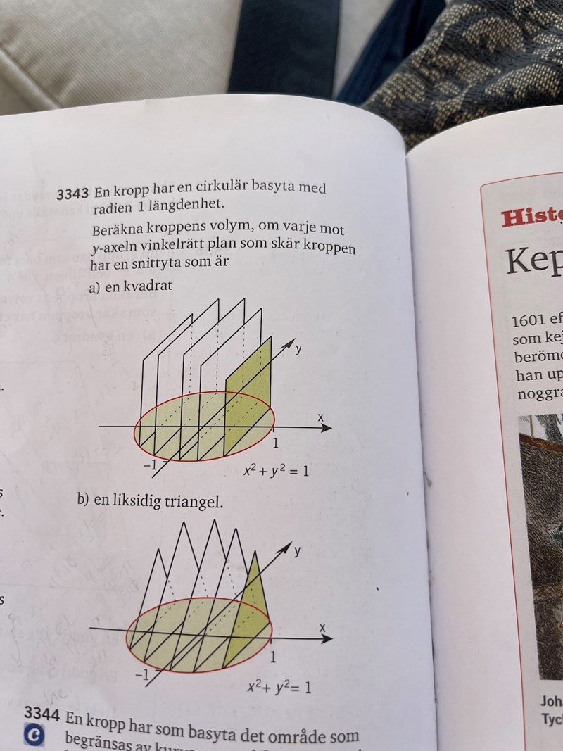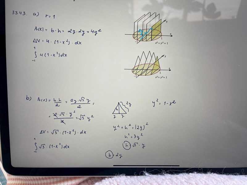 Smaragdalena skrev:Försök att ta fram ett uttryck för hur triangelns area beror på x-värdet för skivan. Du vet att triangelns bas är från ena änden av cirkeln till andra änden, och hur långt detta är beror på x-värdet (basen är från -y(x) till y(x), d v s 2y(x), och att triangeln är liksidig.