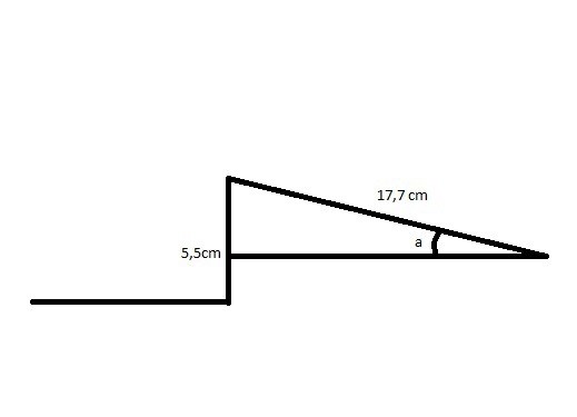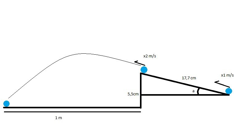 a i detta fallet blir 8,1°. Jag har räknat med en stålkula som har gravitationskraften (Fg) 0,4N. Och komposant kraften (Fg1) som jag har kommit fram till är 0,05N, detta ger enligt mina beräkningar en acceleration nerför rampen med 1,25m/s^2. Eftersom jag vill räkna ut detta endast teoretiskt så sätter jag längden som kulan ska fara som 1m och vill nu räkna ut vilken hastiget jag måste ha i början av rampen(x1) för att få hastigheten i slutet av rampen (x2) för att få kulan att flyga 1m i x-led.