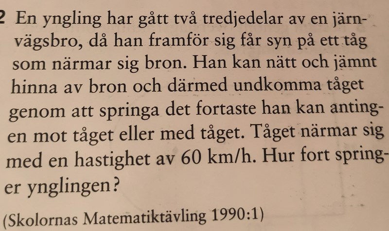Det känns som att det saknas information, 2/3 säger ingenting, det enda vi faktiskt vet är tågets hastighet. Men vi vet inte hur snabbt han faktiskt springer eller avståndet till närmaste utgång av bron, så jag ser inte hur vi ens kan lösa detta.