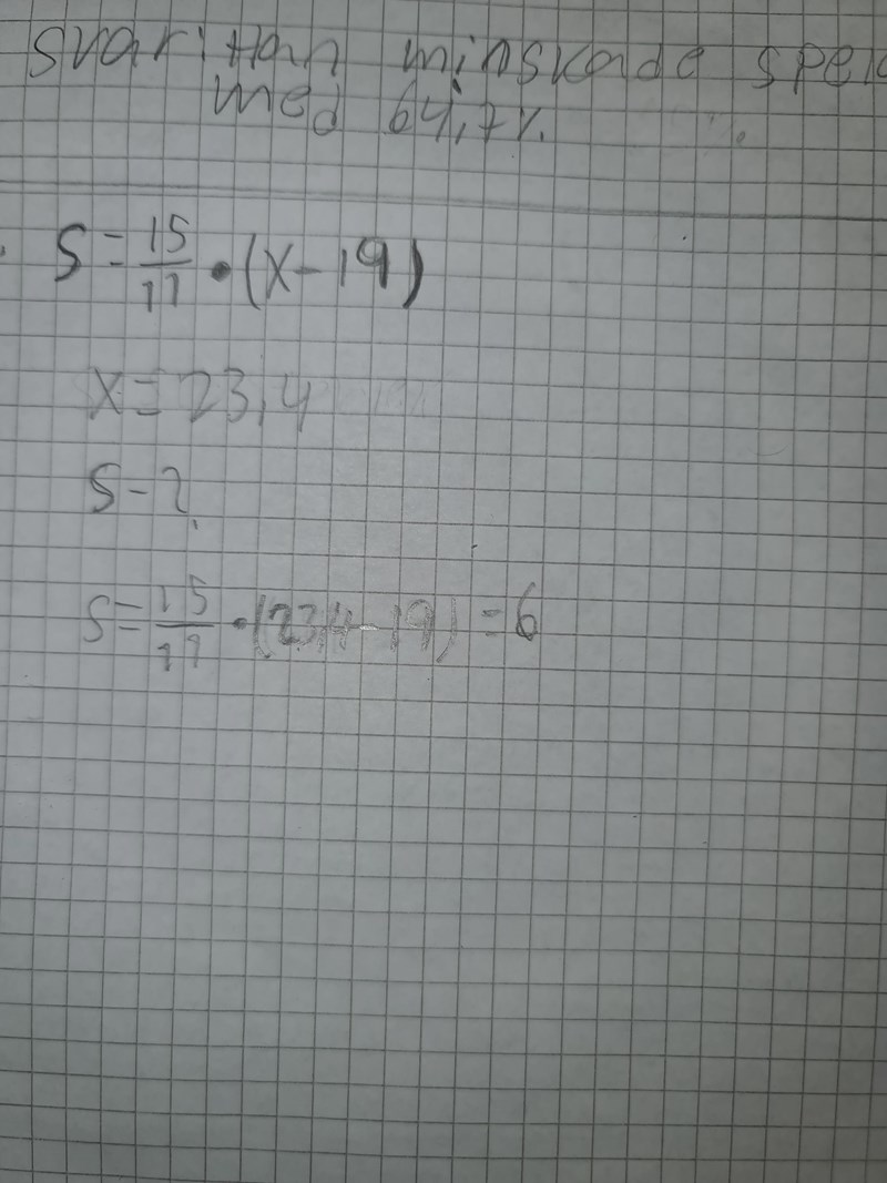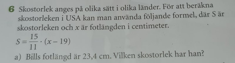 Hur långt har du kommit själv på uppgiften? Har du satt in att x = 23,4 och försökt räkna ut skostorleken S?