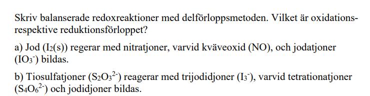 Hej! Jag har svårt att veta hur man ska skriva redoxreaktioner? Exempelvis har ska jag tänka för att lösa b)?