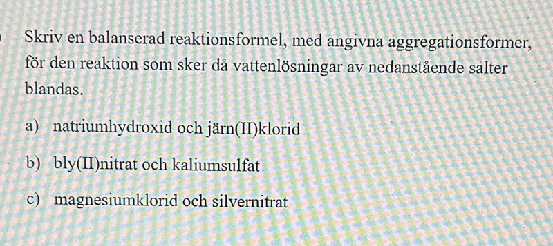 Det jag undrar är hur jag vet om det ska stå "aq" eller "s" på Fe(OH)2 och 2NaCl, och skulle gärna vilja ha hjälp med det! Hur ska jag tänka? Jag tror att det ska stå "s" efter Fe(OH)2 eftersom den innehåller en metallatom, och jag tror det ska stå "aq" efter 2NaCl. Stämmer detta?