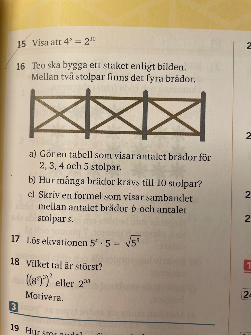 I tabellen gör du två kolumner. I den ena har du antalet stolpar och i den andra har du antalet brädor. Börja med hur många brädor det är mellan två brädor.