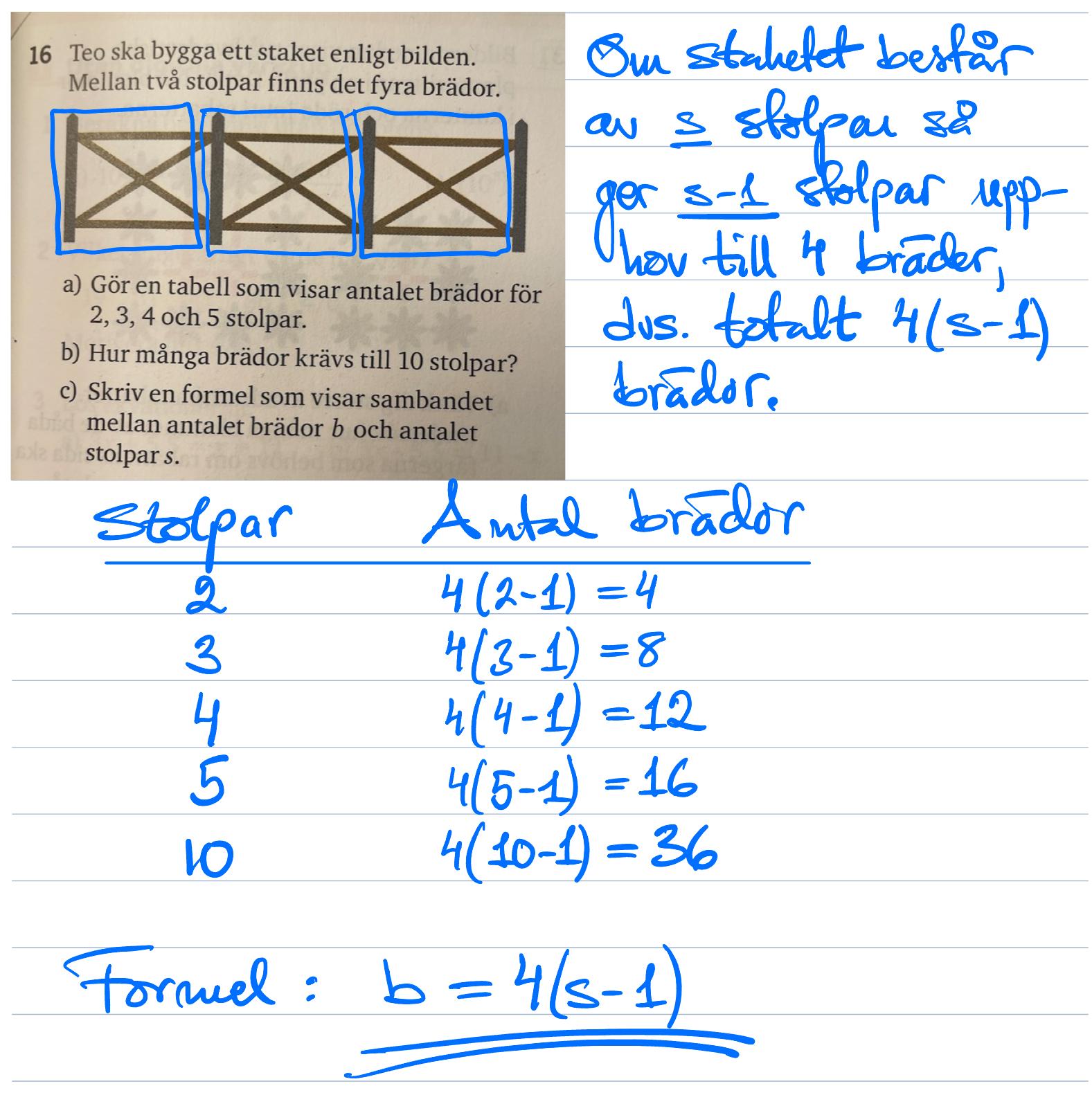 Ta antalet stolpar (eller i andra uppgifter figurnumret) och multiplicera med förändringen mellan varje antal stolpar, i detta fall är det. Kolla sedan vad du behöver kompensera med för att få rätt svar. Det blir sedan din formel. I detta fall S*4-4 (S är antalet stolpar).