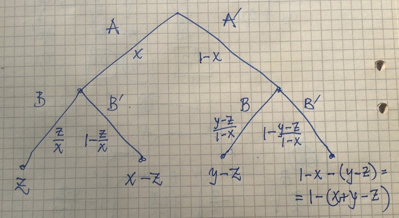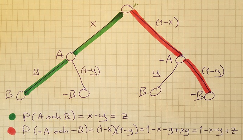 Arktos skrev:Fint träd, men tyvärr gäller det enbart om händelserna är oberoende, dvs om x·y = z .