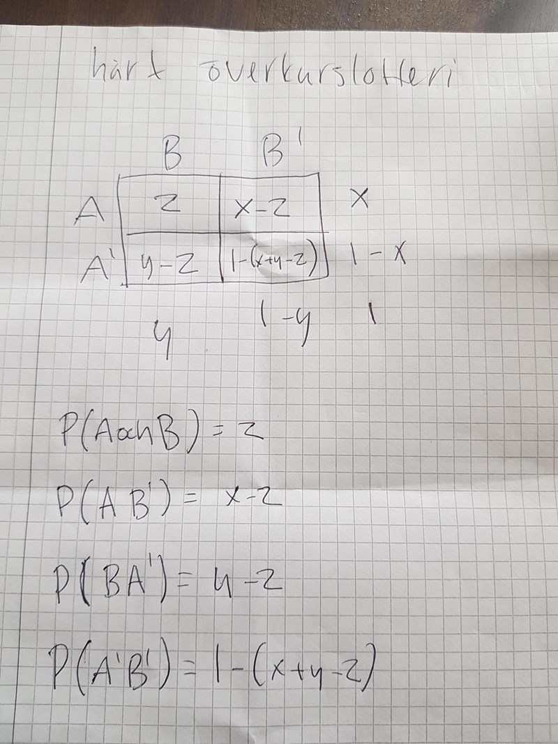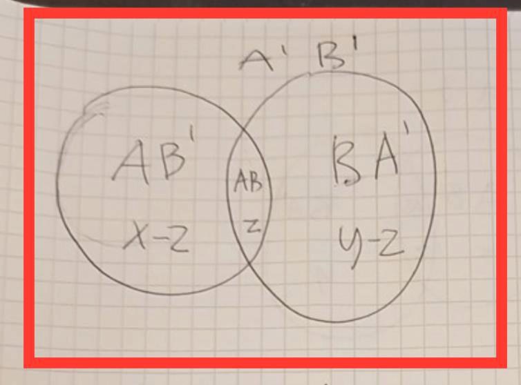 så att P(AB') = x – z och P(BA') = y – z [ Vad blir då P(A'B')? ]