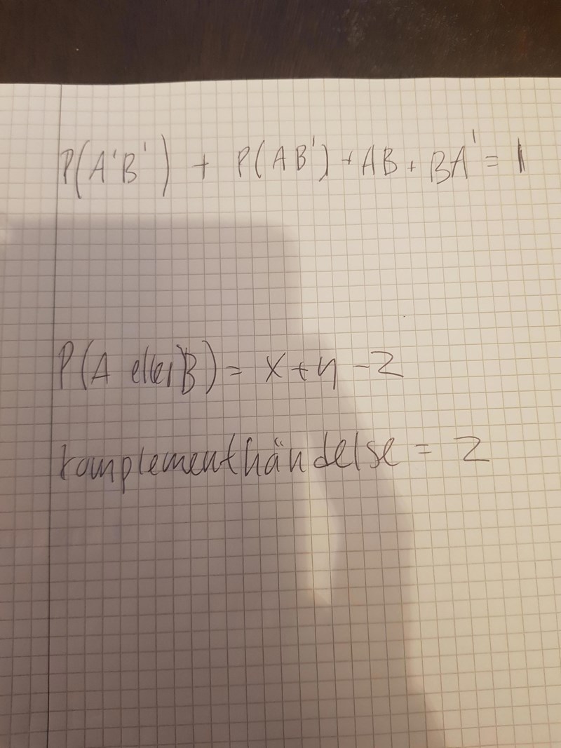 Fråga 2) komplementhändelsen till P(A ellerB) är P(varken A ellerB) = A'B'