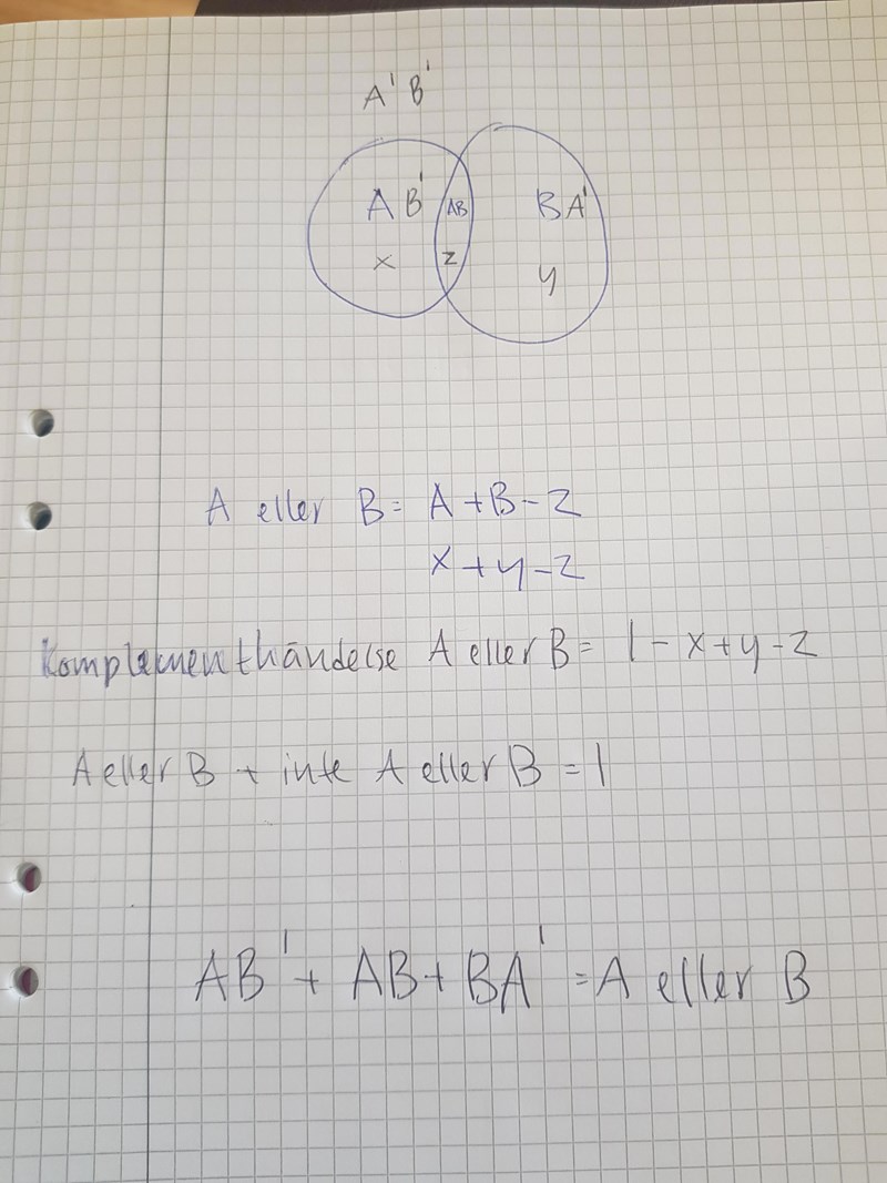 och då blir P(A eller B) = P(AB') + P(AB) + P(BA') = P(A) + P(B) – P(AB) = x + y – z
