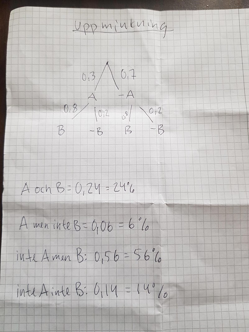 Puh! Det här kan kännas knepigt i början, men inget steg är svårt. Varför gör vi då detta när vi redan räknat ut allt i rutan? Tja, här är det egentligen bara för att visa att man kan komma fram till samma sak med ett träddiagram som med en ruta.