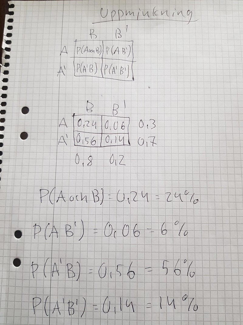 Till Arkos: jag skrev bara frågan rakt av men kan ladda upp en bild! Antar att vi inte vet om A och B är oberoende isåfall.