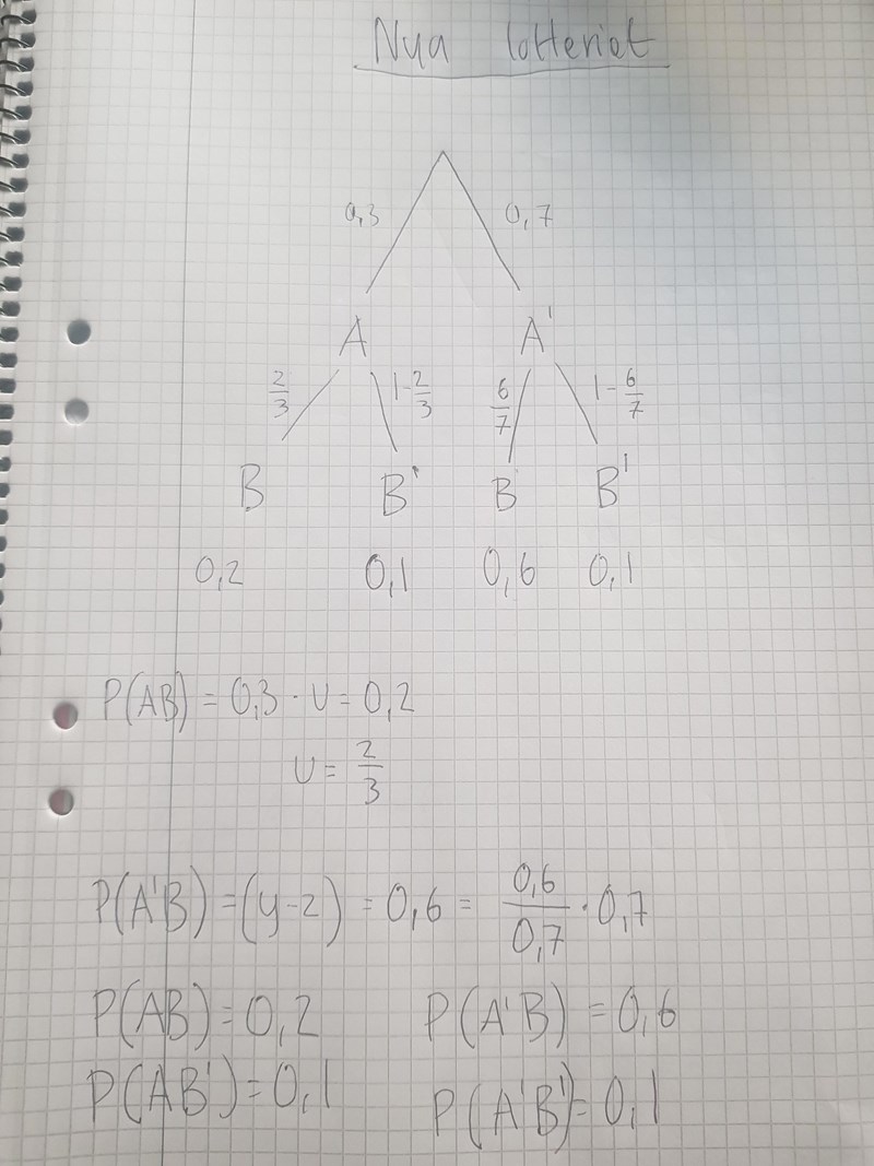 så P(A’B) = P(B) – P(AB) = y – z = 0,8 – 0,2 = 0,6. Vägen dit börjar med A’ som har sannolikheten 0,7 . Grenen till trädtoppen får då sannolikheten 0,6/0,7 = 6/7 (runda inte av!) för att produkten ska bli den rätta: 0,7 · 0,6/0,7 = 0,6 .