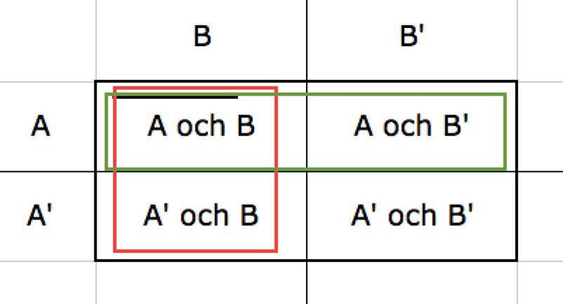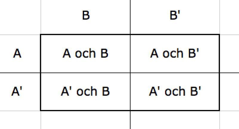 (A men inte B, både A och B, B men inte A, varken A eller B)