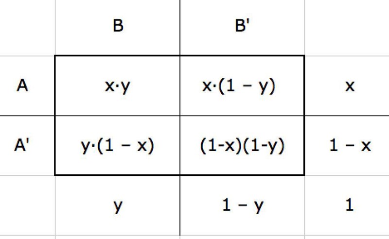 Då är alltså P(B) = P(AB) / P(A) och vi får det vanliga sambandet P(A)· P(B) = P(AB),