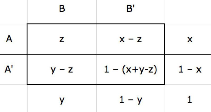 z = P(AB); x = P(A) = z + P(AB'); y = P(B) = z + P(BA'),