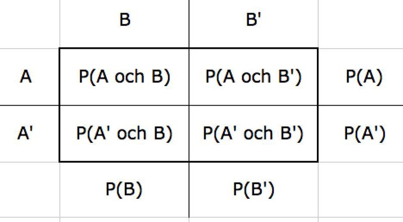 Övriga sannolikheter kan vi beräkna eftersom radsummor och spaltsummor är kända.