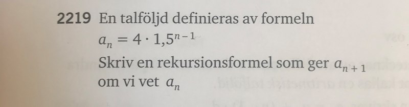 har skrivit upp vad a1, a2, a3 etc är genom att byta ut n mot 1, 2, ... utifrån angiven formel och fått olika värden men förstår ej hur jag ska få fram rekursivaformeln från detta?