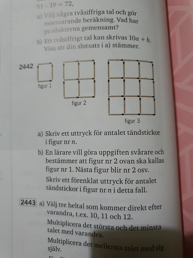 Det är uppgift 2442 a jag behöver hjälp med. Jag vet inte vilken metod jag ska använda eller hur jag ska tänka för att komma vidare. Det enda jag har kommit på är att antalet stickor ingår i fyrans multiplikationstabell. Men jag kan inte hitta något mer samband om hur uttrycket kan se ut...