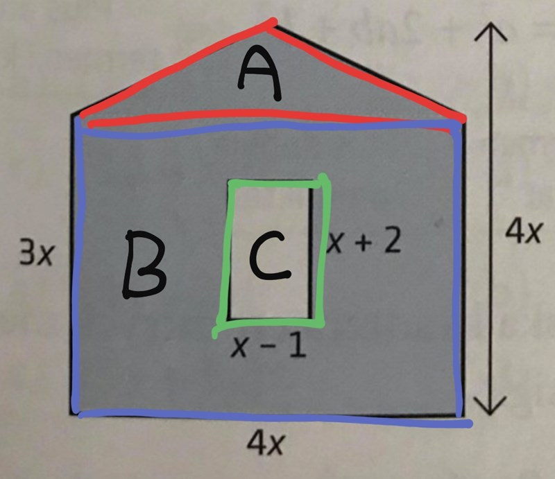 Jag skulle dela upp figuren i en röd triangel A, en blå rektangel B och en grön rektangel C.