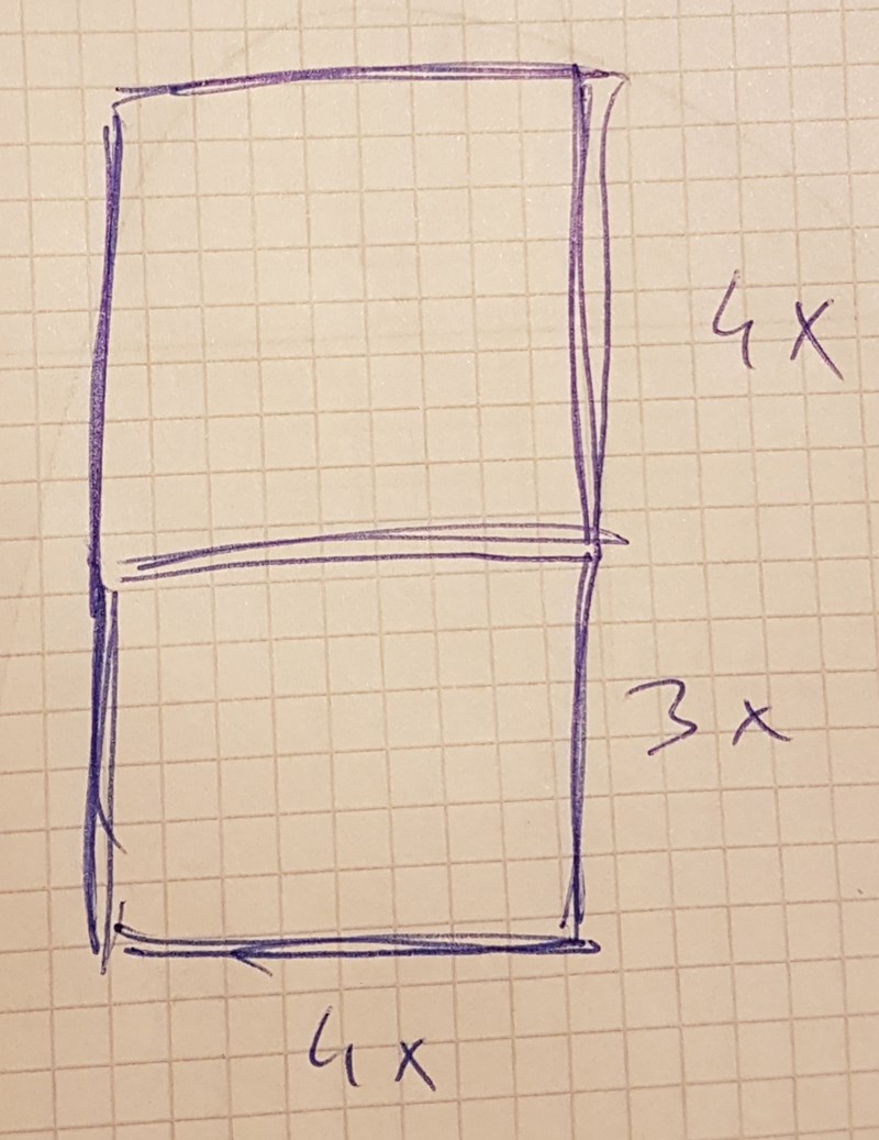 Yngve skrev:Jag förstår inte dina uträkningar. Varför 4x(3x+4x)? Den arean motsvarar en figur som ser ut så här, men det finns ingen sådan i uppgiften: