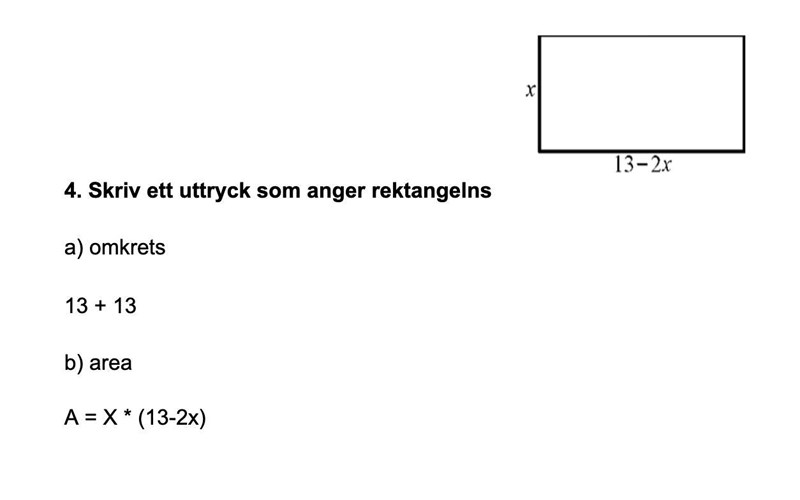 Har jag tänkt rätt här? Jag tänker att iom att långsidan har -2x så försvinner dem ju från de vertikala sidorna och kvar blir man med 13 på varje horisontal sida. Dvs 26 i omkrets.