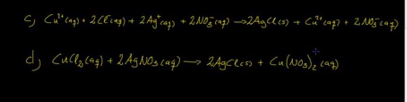 c) Skriv formeln för utfällningsreaktionen genom att ange samtliga jonslag som deltar i reaktionen, alltså Cu2+ (aq) + 2 Cl- (aq) + ...
