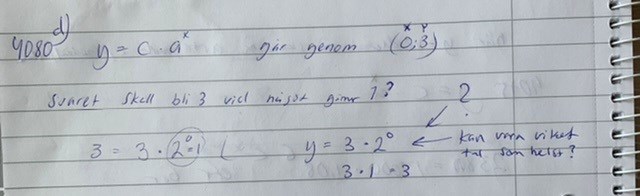 För att grafen ska gå genom punkten (0, 3) så måste sambandet 3=C·a03=C\cdot a^0 gälla, vilket betyder att 3=C·13=C\cdot1, dvs C=3C=3.