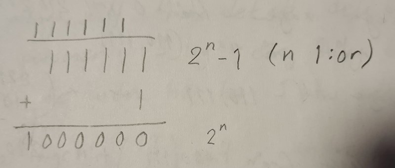 Man kan t.ex. ställa upp det så här, de n st. 1:orna adderas med 1 och om n st. 1:or är 2^n - 1 så skall vi få 2^n när vi adderar 1. 1:orna ovanför är i minne, precis som när vi ställer upp vanlig addition: