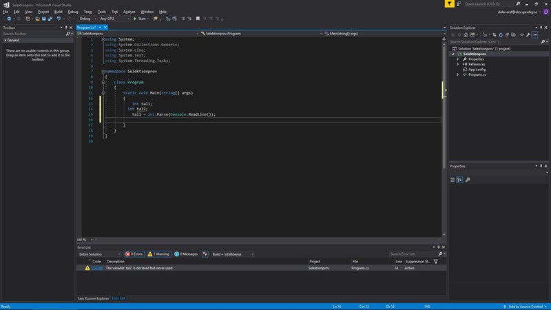 I din skärmdump finns variablerna tal1 och tal2 redan deklarerade. Koden läser redan in ett tal till variabeln tal1. Gör på liknande sätt för att läsa in det andra talet och spara i variabeln tal2. Jämför sedan talen som ligger i de två variablerna.