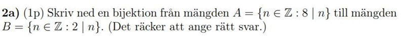jag vet att en bijektion är en funktion som är både surjektiv och injektiv och varje element har en avbildning men förstår inte riktigt vad det är jag ska räkna på här? ska jag skriva ihop en egen mängd och testa med några n eller förstår inte riktigt vad jag ska göra