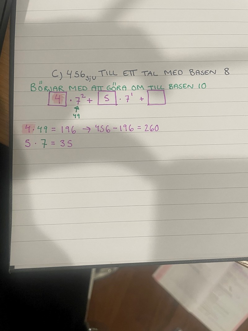 Det gäller att (456)sju = (4•72+5•71+6•70)tio = (4•49+5•7+6•1)tio = (237)tio