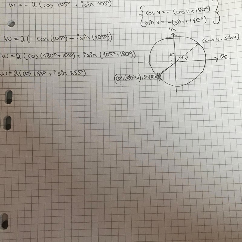 Skriv talet i polär form w = -2(cos 105* + isin 105*)