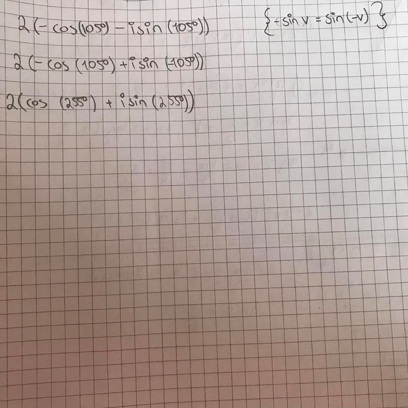 Och jag fick det till w = 2(cos 255* + isin 255*) vilket är fel enligt facit. Vinkeln är istället 285* (grader). Jag förstår inte varför...