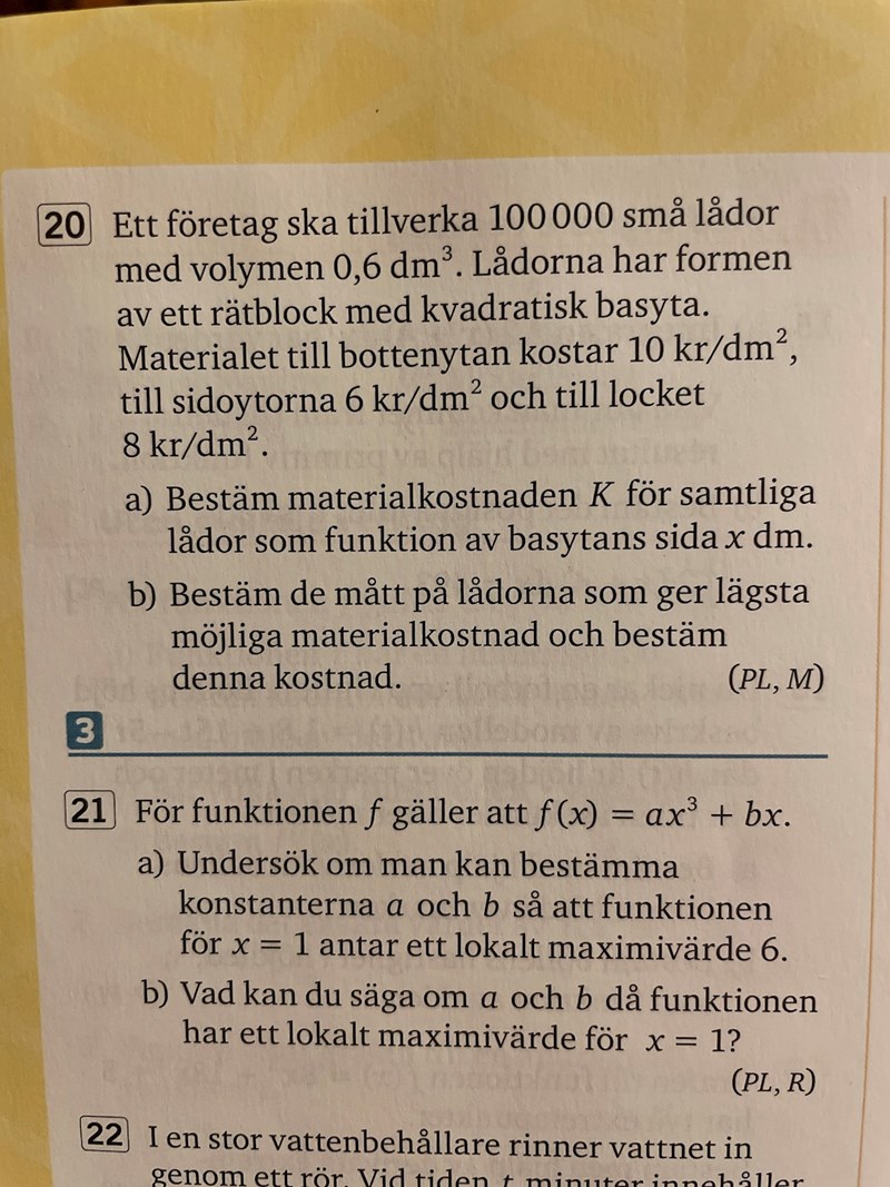 Hej! Har gjort uppgift 20 men fått fel på a) vilket ger mig fel svar att jobba vidare med i b). I facit ska det vara K(x)=10000(18x^2+(14,4/x)). Vad gör jag fel?
