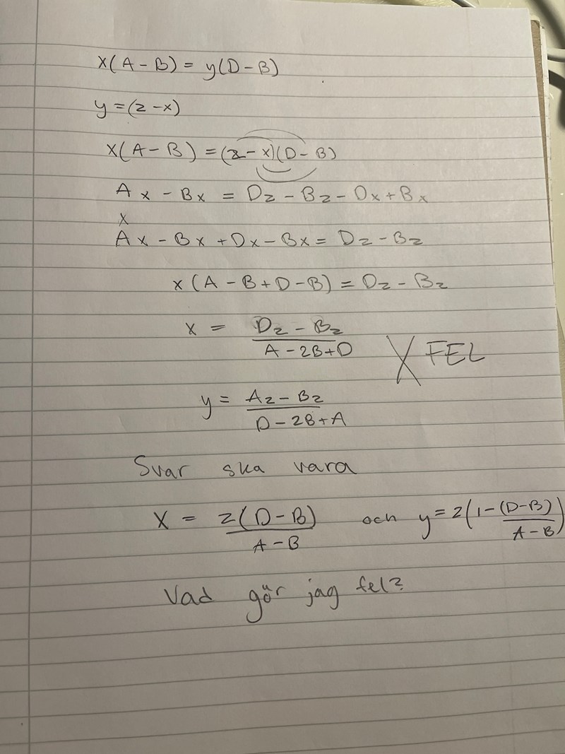 Hej! Jag har försökt lösa denna fråga, och får nästan rätt svar. Tror att jag gjort något slarvfel eller missat något, men kan verkligen inte se vad. Tror att jag har stirrat mig lite blind på frågan så uppskattar verkligen om någon kan hitta vad jag gjort fel!