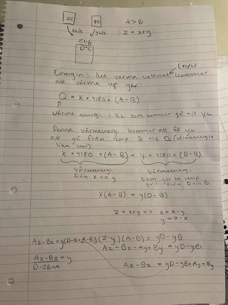 Tänk dig att den energin som tillförs genom det kalla och varma vattnet ska vara lika med den som bortförs i det blandade vattnet.
