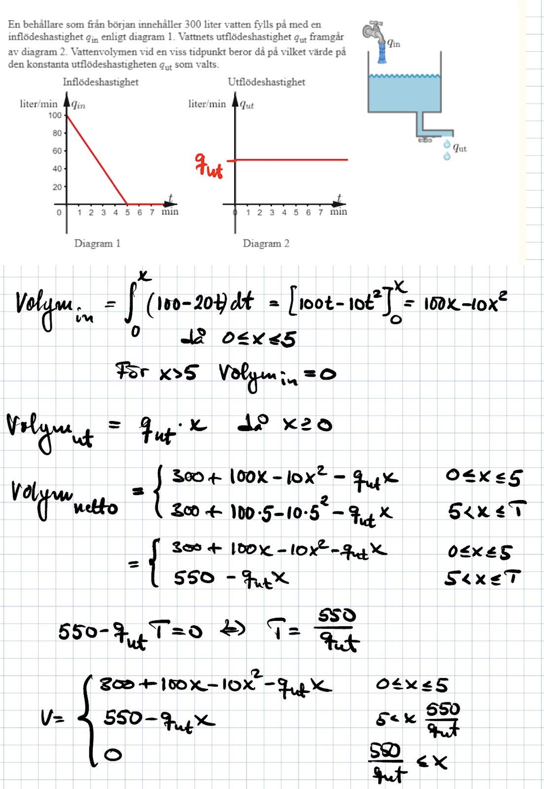 Enligt facit är det nämligen enbart den första som stämmer. Dessutom har de valt att skriva inflödeshastigheten med primtiv funktion. Detta förstår jag inte heller då det blir: inflödeshastighet = -10t^2 +100t + C. Men har vi ett värde för att beräkna även C?