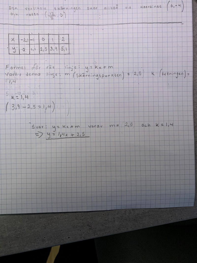 Så formeln blir alltså y= kx + m varav m = 2,5 och k = 1,4 ? Rätta mig om jag har fel