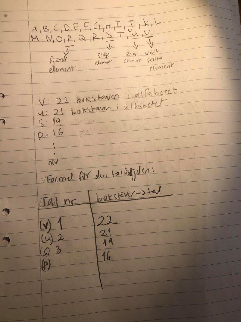 Det är ju svårt att skriva formler för bokstäver, så du kan ju börja med att omvandla bokstäverna till tal. V är alfabetets 22:e bokstav, så låt V motsvaras av 22, o.s.v.