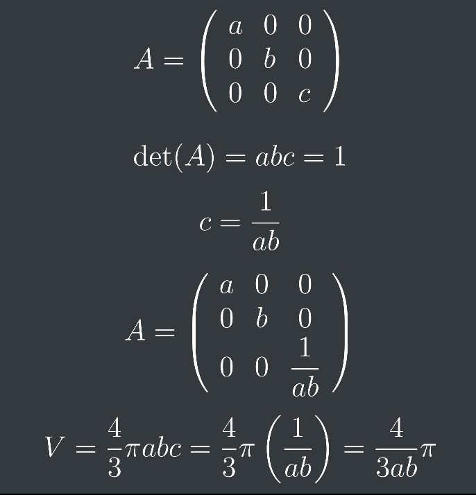 En matris med a,b och c i diagonalen är en sådan avbildning. Determinanten a*b*c representerar skalningsfaktorn för volymen mellan enhetssfären till sfäroiden. För att avbildningsvolymen ska förbli oförändrad behöver a*b*c=1