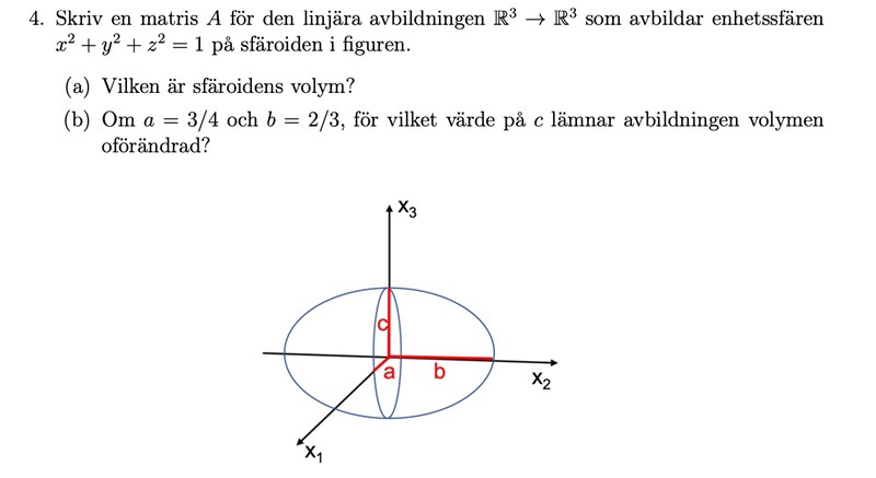 Jag förstår hur man kan använda en diagonal matris med a, b och c som element för att beskriva en skalning av koordinataxlarna i en linjär avbildning, men jag är fortfarande osäker på hur jag ska gå vidare för att hitta matrisen som avbildar enhetssfären på sfäroiden i figuren och svara på frågorna om sfäroids volym och värdet på c för vilket avbildningsvolymen är oförändrad. Skulle du kunna förklara mer i detalj hur man kan hitta utifrån den information som ges i uppgiften?