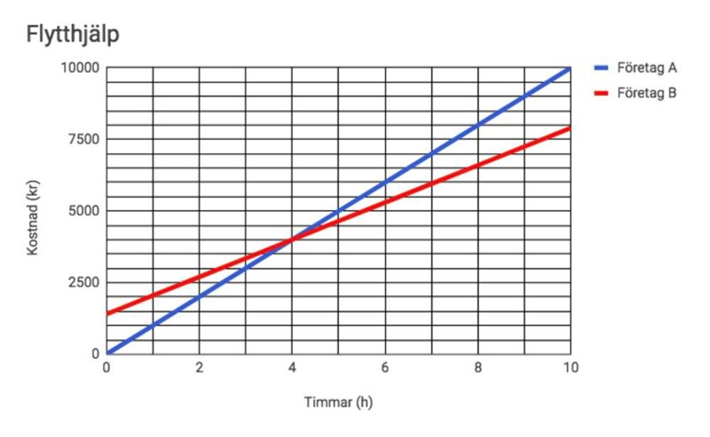 Jag skulle behöva hjälp med att skriva en formel till Företag B. Jag förstår inte riktigt hur jag ska göra det med tanke på att grafen inte går "rätt igenom linjerna". Jag vet att +1500 ska vara med i formeln eftersom det är en fast kostnad, men jag förstår inte hur jag ska göra nu.