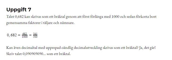 Exempel 2: Decimaltalet 0,78657865... där alltså sekvensen 7865 upprepar sig.