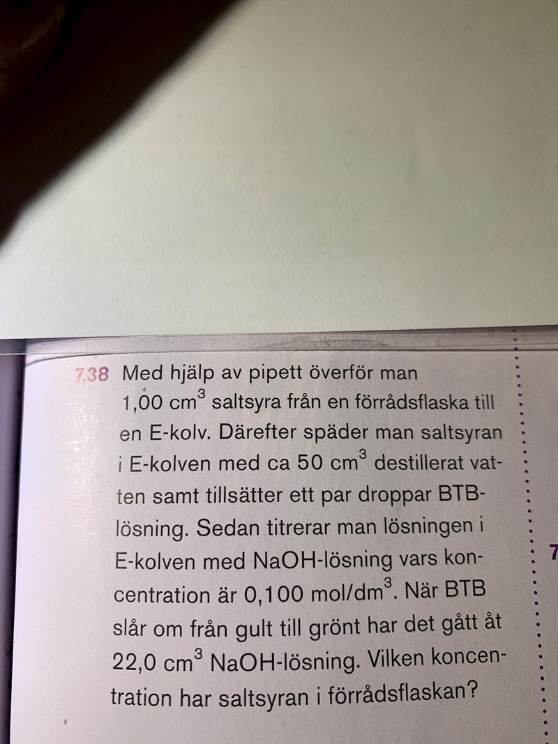 Det är en korrekt reaktionsformel utan åskådarjoner, om man accepterar H+ som en "förenkling" av oxoniumjonen H3O+. Då ser du att det behövs lika många oxoniumjoner som hydroxidjoner, så vid ekvivalenspunkten (när färgen slår om till grönt) har man tillsatt lika många mol hydroxidjoner som det fanns oxoniumjoner (och därmed HCl innan den protolyserades). Då vet du hur många mol HCl det fanns i 1,00 mol av lösningen i förrådsflaskan, eller hur?
