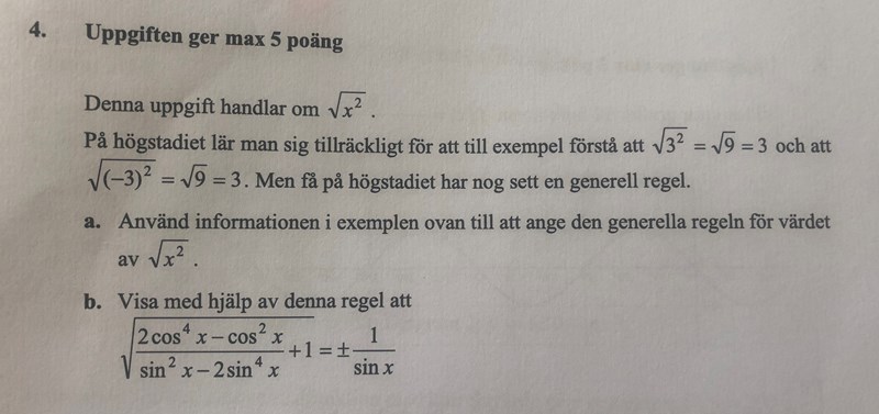Jag vet inte hur jag ska göra på denna uppgiften. Jag vet att jag måste skriva om VL men det förvirrar mig när det är roten ur. Är det dubbla vinkeln jag ska använda mig av?