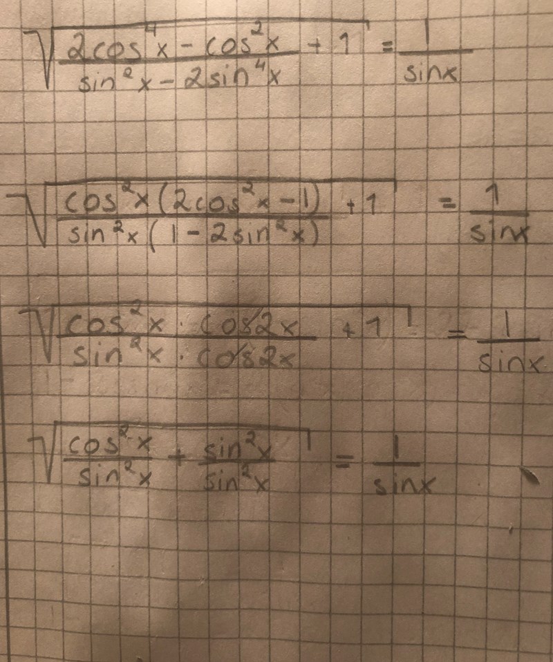 Jag gjorde om ettan till sin^2x/sin^2x...då har du trigometriska ettan i täljaren och sin^2x i nämnaren. Det blir 1/sinx när kvadratroten dragits