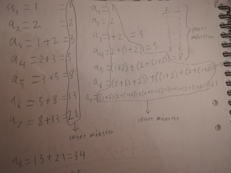 Sekvensen i sig är ganska känd. Kallas för fibonaccis talföljd och man kan läsa om den slutna formlen direkt https://en.wikipedia.org/wiki/Fibonacci_number#Closed-form_expression. En Ma5-elev kan nog lära sig en metod för att ta fram den slutna formeln men en brukar inte undervisas i Ma5.