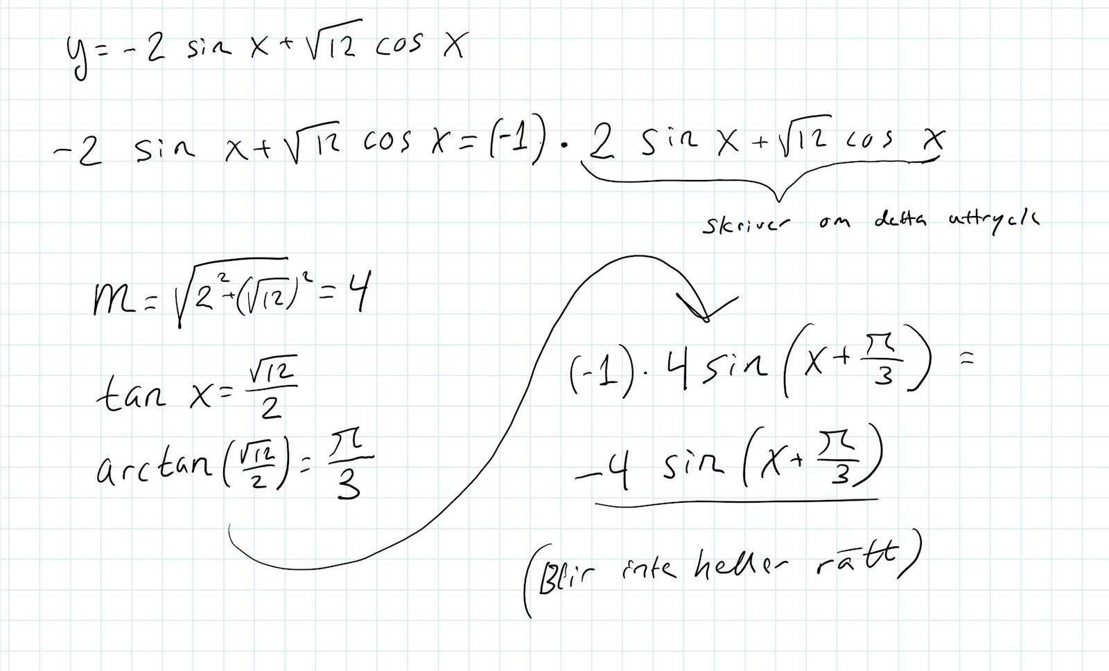 "Skriv funktionen y = -2 sin x + cos x på formen y = m sin (x+v)"