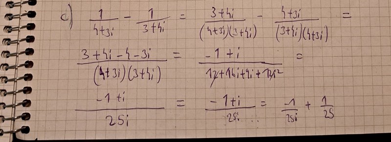 Jo det är sant men det är bara för att 16i+9i=25i i nämnaren. I täljaren har vi -1+i/25i= -1/25i+1/25
