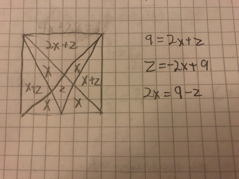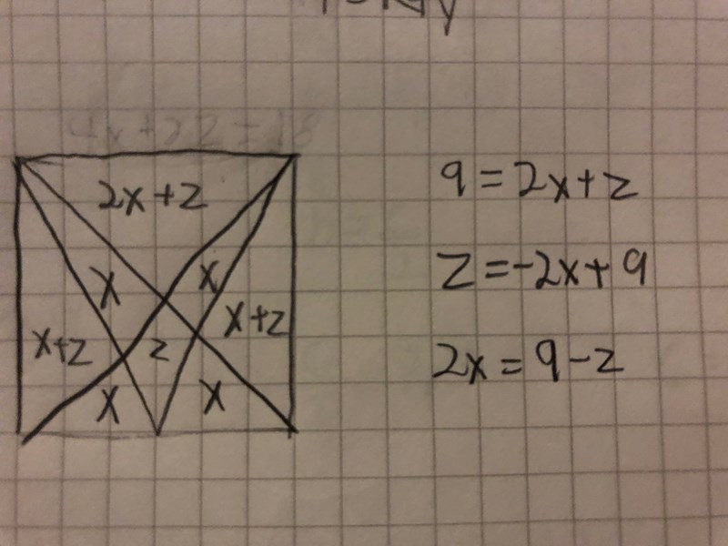 varje sida är 6cm. Jag har kommit fram till att arean är 36cm och om jag har delat upp den i fyra trianglar som alla är 9cm. Jag har räknat och kom fram till att den skuggade arean borde vara 3cm men kan inte bevisa det. Jag kan bryta in den i rektanglar men vill hellre ha en algebraisk lösning. Tacksam för all hjälp jag kan få.